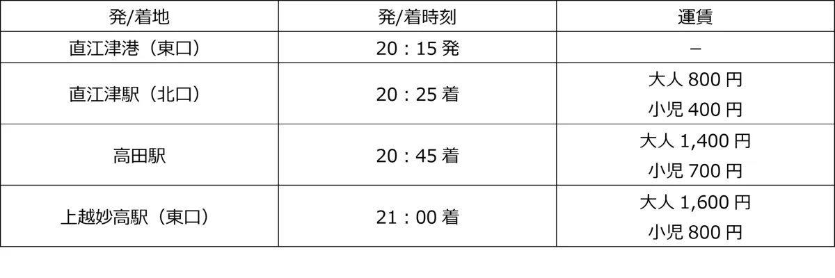 直江津港の東口から発車する駅ライナー便は、20:05に到着する「こがね丸」に接続しますので、到着後すぐにご利用可能です。ただし、運行は片道のみですので、途中乗車はできません。旅の計画を立てる際は、交通状況によって発着時刻が変わる可能性がある点も留意しましょう。