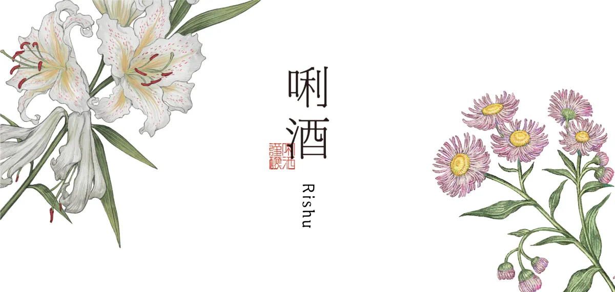 「唎酒 Rishu」では、製造地の新潟県・魚沼に自生する花々をラベルデザインに使っています。美しい色や形、さらには蕾から枯れるまでの変化を通して、お酒の質を視覚的にも楽しむことができます。酒を飲む前から味わいを想像しながら、ラベルから感じる美しさと楽しさが加わります。