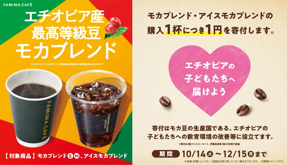 株式会社ファミリーマートは、全国のファミリーマート店舗で「FAMIMA CAFÉ」の人気商品である「モカブレンド」と「アイスモカブレンド」の販売数に応じて、エチオピアの子どもたちの教育環境の改善へ寄付を行うことを発表しました。この取り組みは、2025年10月14日から全国約16,000店舗で開始され、販売数に応じて寄付が行われるしくみです。ファミリーマートは、アフリカのエチオピアに向けた支援にも新たに取り組み、コーヒー農園への苗木寄付を通じて持続可能な農業を支援する方針です。