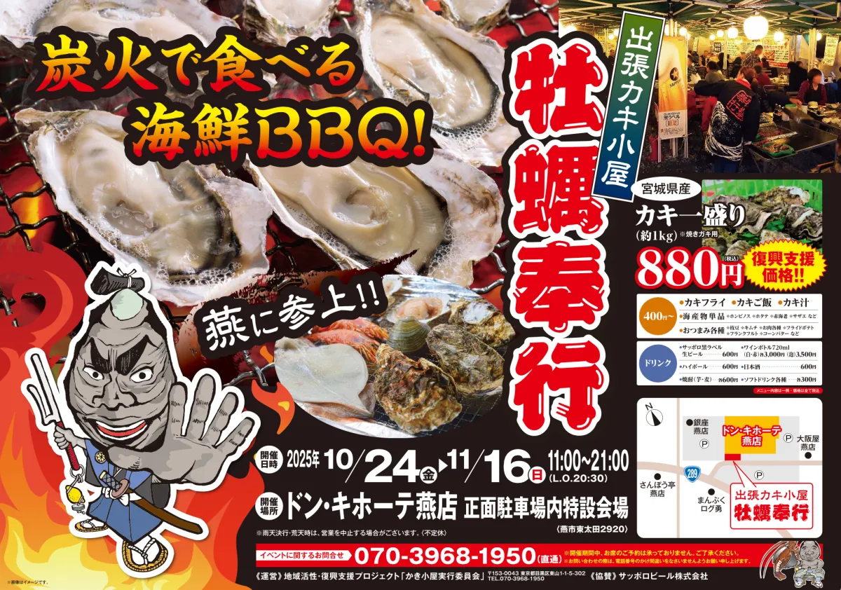新潟県燕市にあるドン・キホーテ燕店の駐車場で、10月24日から期間限定で「出張カキ小屋」がオープンします。このイベントでは、宮城県産の新鮮な生牡蠣が一盛り880円で楽しめるほか、さまざまな海鮮メニューも取り揃えています。
