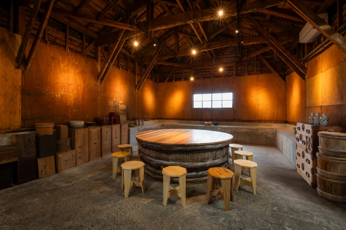 さらに進むと、「石蔵」と名付けられた体験スペースがあります。この場所は元々醤油を仕込んでいた歴史のあるエリアで、リノベーションによりその雰囲気を残しています。ここでは発酵に関するワークショップやイベントが開催され、訪れた人々は地域の食文化をより深く学ぶことができます。中央に設置されたテーブルは、古い木桶をリメイクしたもので、蔵の歴史を感じることができる工夫が凝らされています。