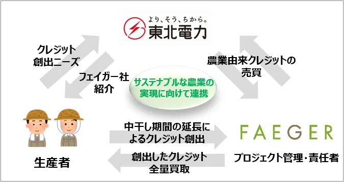 このプロジェクトの実施にあたり、東北電力は株式会社フェイガーと連携しています。フェイガーは、農業由来カーボン・クレジットの生成から販売までを一貫して手がける企業であり、その豊富な経験と実績が活用されます。