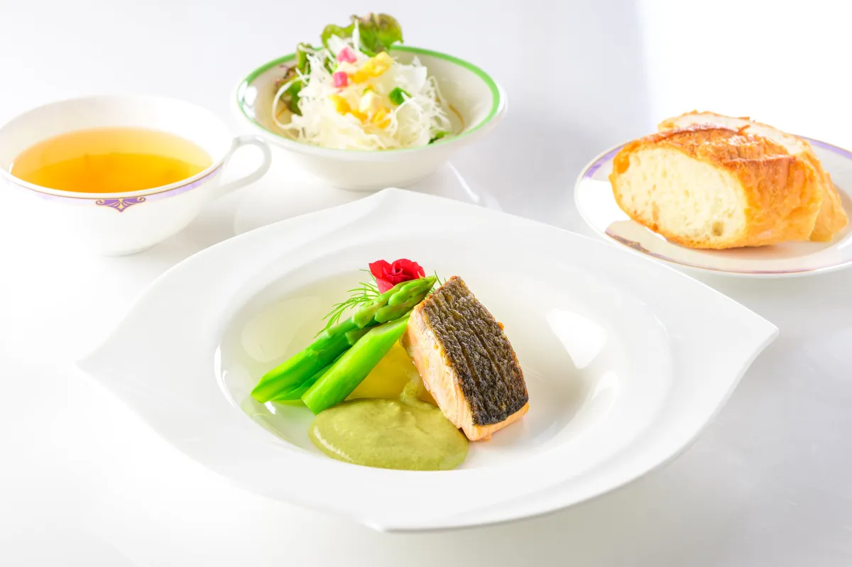 2,050円のこちらの料理は、アスパラと桜鱒を包み込み、蒸し焼きにすることで素材の香りを最大限に引き出しています。ご飯、味噌汁、香の物が付いて、和のテイストも楽しむことができます。